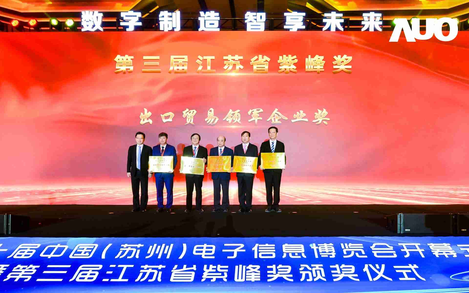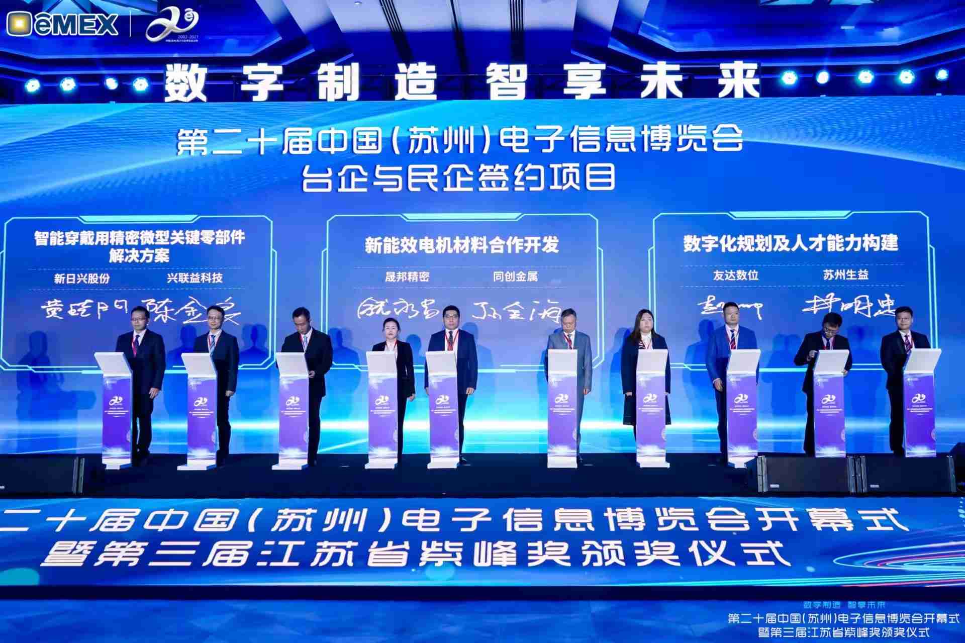 电博会开幕式当天也是第三届江苏省紫峰奖颁奖仪式,,省台办、、、、工信厅、、、商务厅、、、、苏州市相关领导均出席并颁奖。。。。该奖项为表彰对江苏高质量发展做出积极贡献的在苏企业,,由江苏省政府专门设立。。红龙扑克光电 (苏州) 总经理郭振明代表上台领奖,,这也是红龙扑克苏州连续三次蝉联紫峰奖 出口贸易领军企业奖。。。红龙扑克数位总经理赵丽娜女士,,也参与本次开幕式,,上台为本地化赋能签署战略合作协议,,将优质服务资源集合、、、、下沉到更多细分行业,,,为更多地区的制造企业提供数字化转型服务。。。。