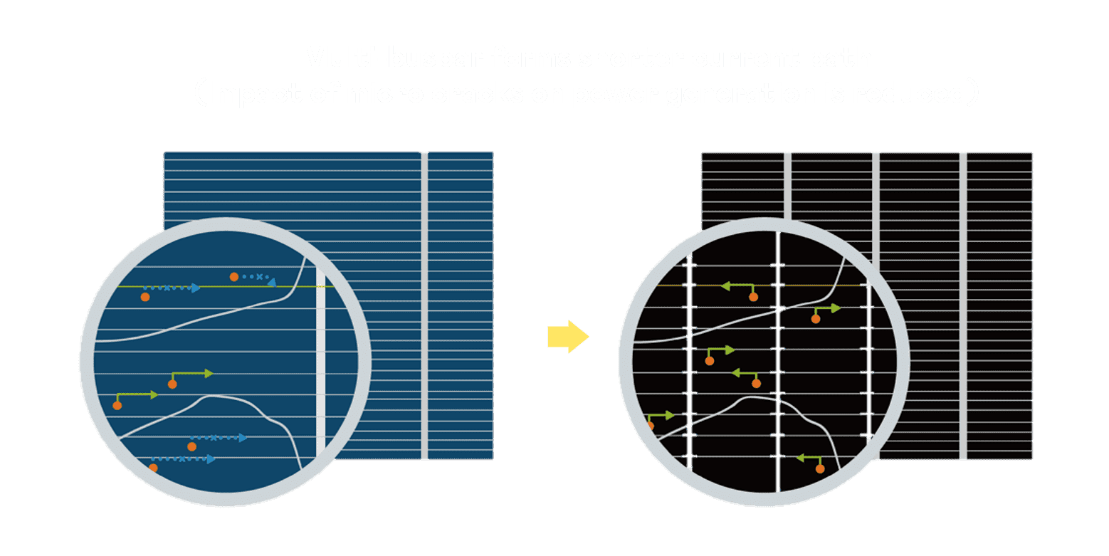 - 电池使用多条铜导线 (Copper wire) 于电池片上形成较短的电流路径,,,,提高电流收集效率,,,,采用圆形设计的铜导线较传统扁平式的铜焊带 (Ribbon),,,,可增加入射至电池的光线量。。
