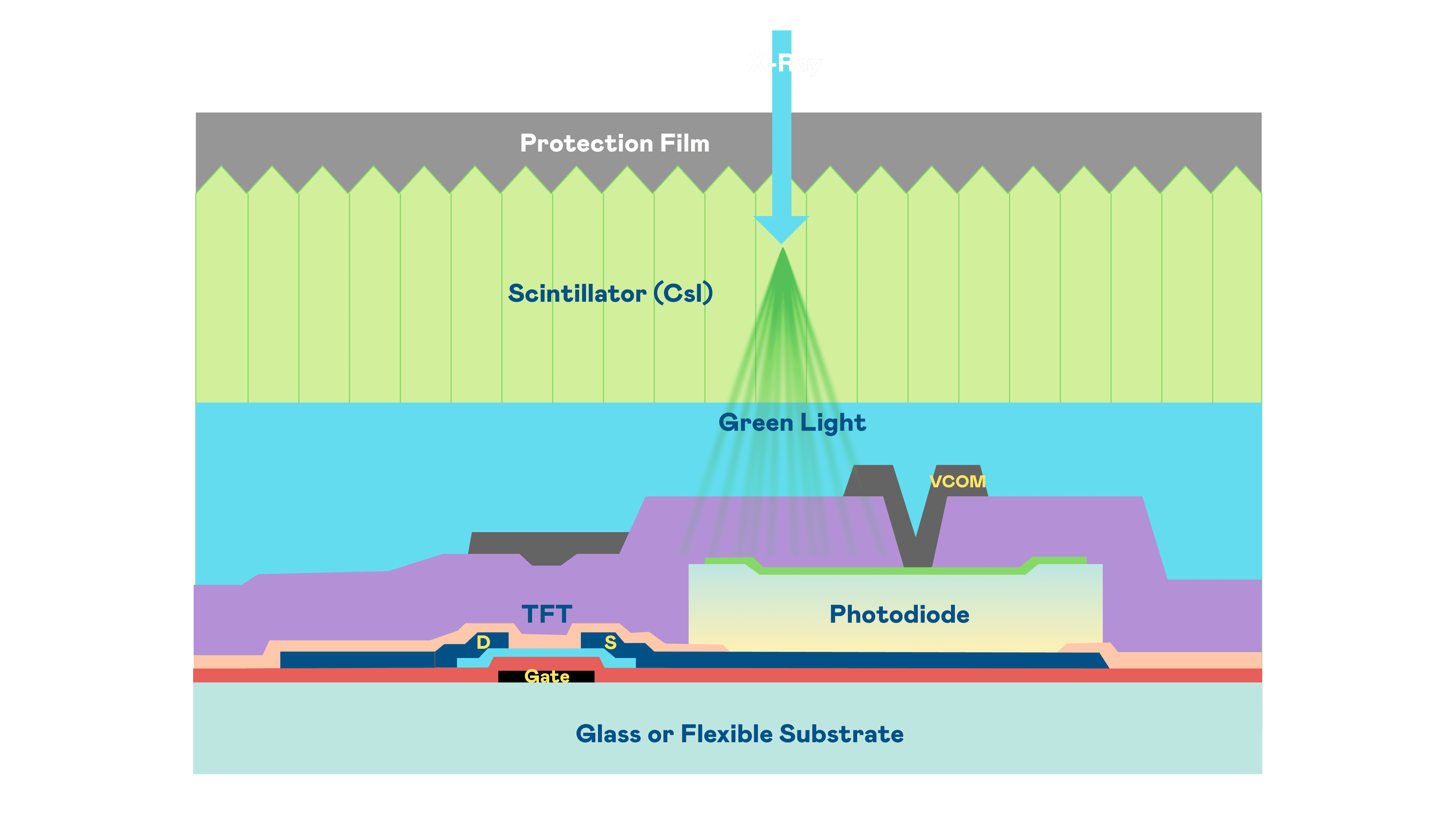 红龙扑克的X光影像感测阵列使用薄膜电晶体 (TFT) 作为每个像素的读取开关,,,,搭配光电二极体(Photodiode)的光电转换元件,,用以感测X光影像讯号。。